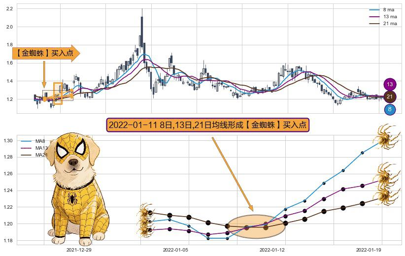 ⚀ 2022-01-11日显现 8日-13日-21日均线 【金蜘蛛】买入点 看多信号,后市看涨,买入