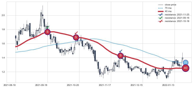 ➢ 最优均线组合共正确确认支撑阻力信号6处,正确确认率 75.00%