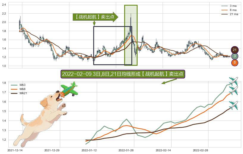 ⚀ 2022-01-07日-2022-03-08日显现 3日-8日-21日均线 【战机起航】卖出点 看空信号,后市看跌,卖出