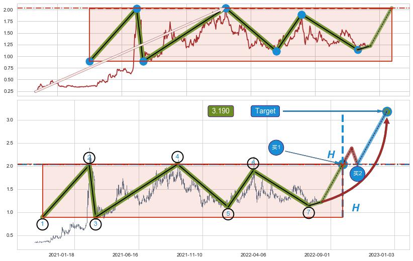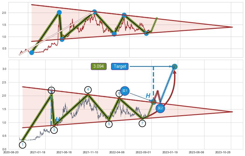 ➢ 最小中继整理涨幅→𝐇: 1.3212 (高点逐步降低斜边第一阻力点②与支撑边垂直距离)
