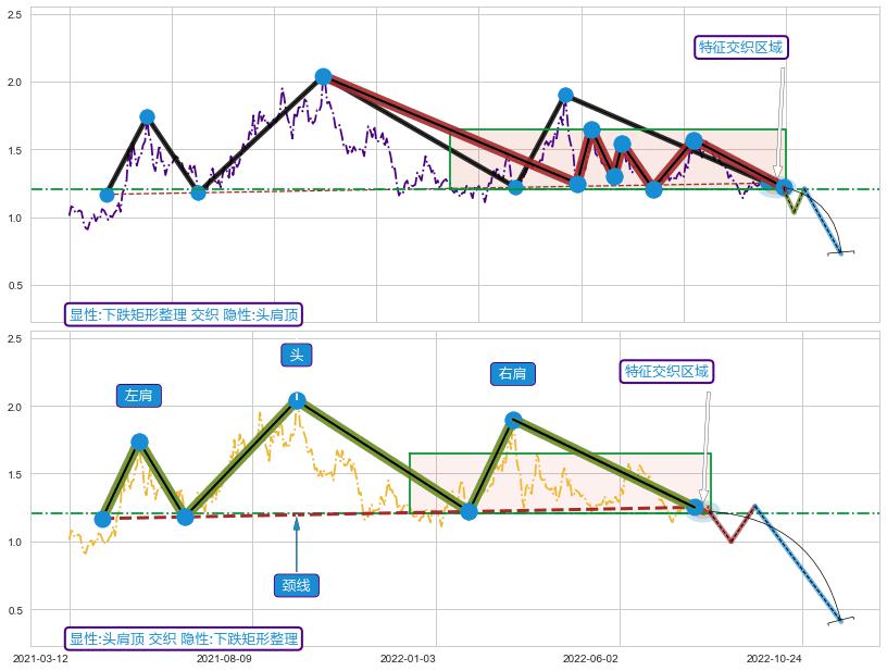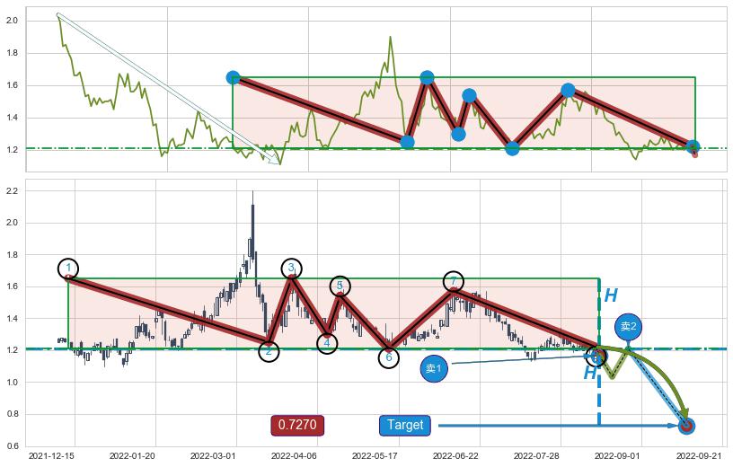 ➣ 【未确认突破,预测即将形成突破】下跌矩形整理起点:2021-09-10, 预测突破点:2022-08-15,形态共227交易日