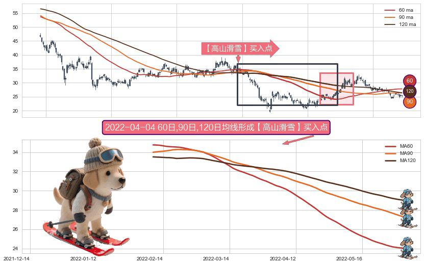 ⚀ 2022-02-09日-2022-06-01日显现 60日-90日-120日均线 【高山滑雪】买入点 看多信号,后市看涨,买入