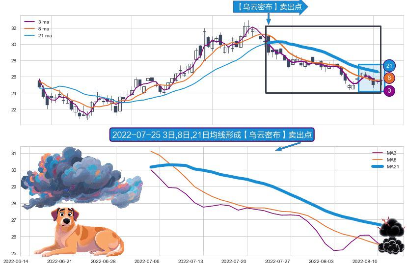 ⚀ 2022-07-05日-2022-08-11日显现 3日-8日-21日均线 【乌云密布】卖出点 看空信号,后市看跌,卖出
