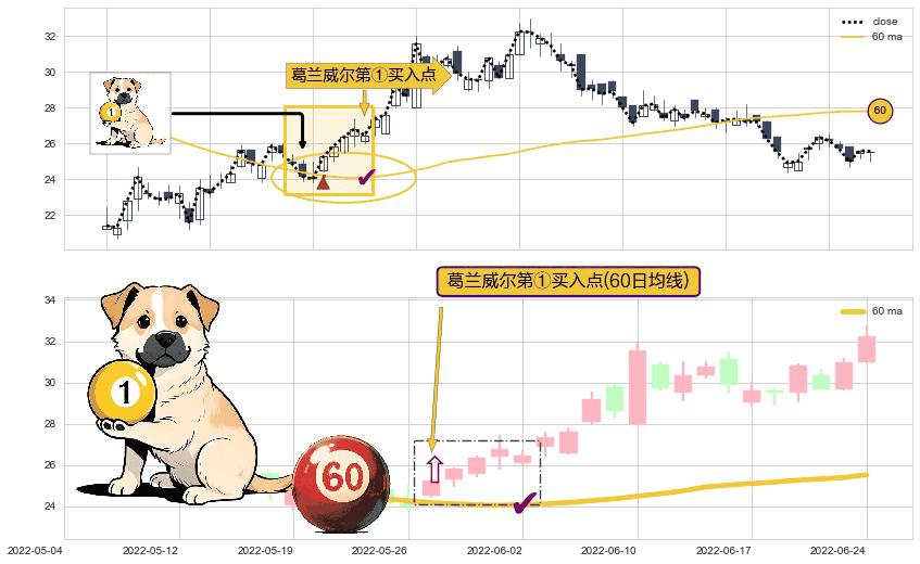 ⚀ 2022-05-27-日显现 葛兰威尔均线 60日均线 第买①入点 走势反转见底信号,后市看涨,买进信号