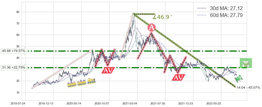 ♘ 阻力价格位45.88,可信任强度70.69%,距离最后交易2022-08-12形成的收盘价格25.55相差 +79.57%