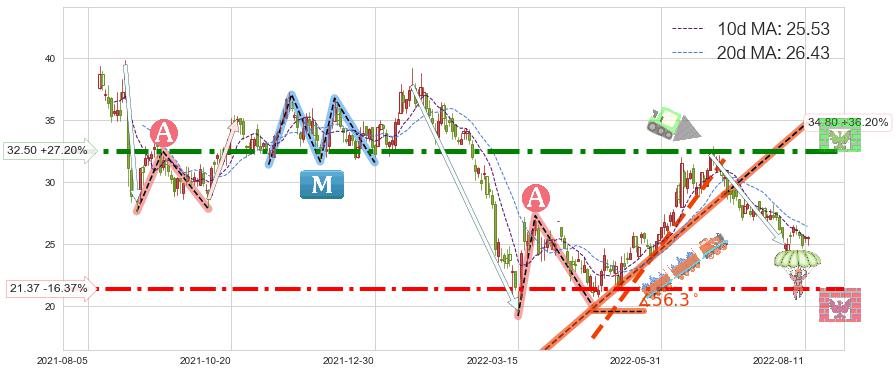 ♘ 阻力价格位32.50,可信任强度93.60%,距离最后交易2022-08-12形成的收盘价格25.55相差 +27.20%