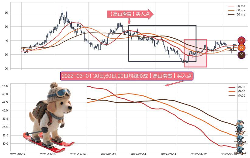 ⚀ 2021-12-15日-2022-05-16日显现 30日-60日-90日均线 【高山滑雪】买入点 看多信号,后市看涨,买入