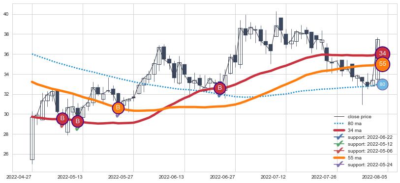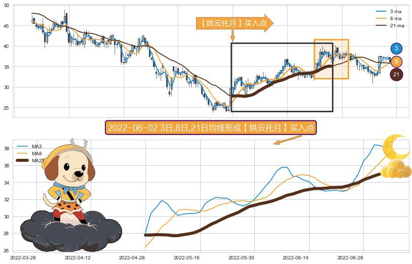 ⚀ 2022-04-28日-2022-07-06日显现 3日-8日-21日均线 【烘云托月】买入点 看多信号,后市看涨,买入