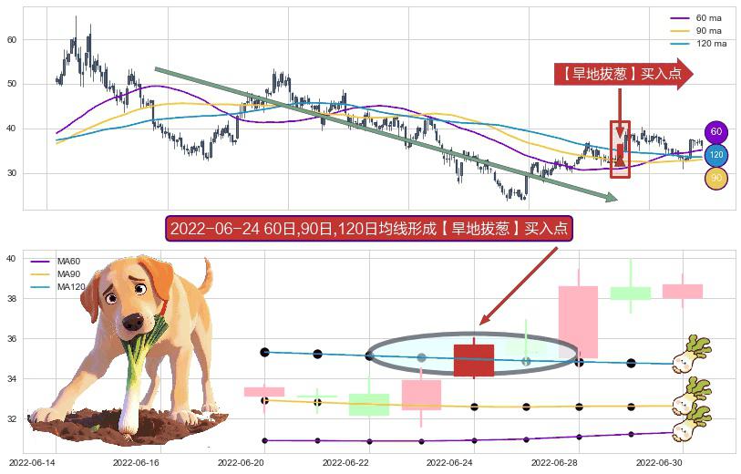 ⚀ 2022-06-24日显现 60日-90日-120日均线 【旱地拔葱】买入点 看多信号,后市看涨,买入