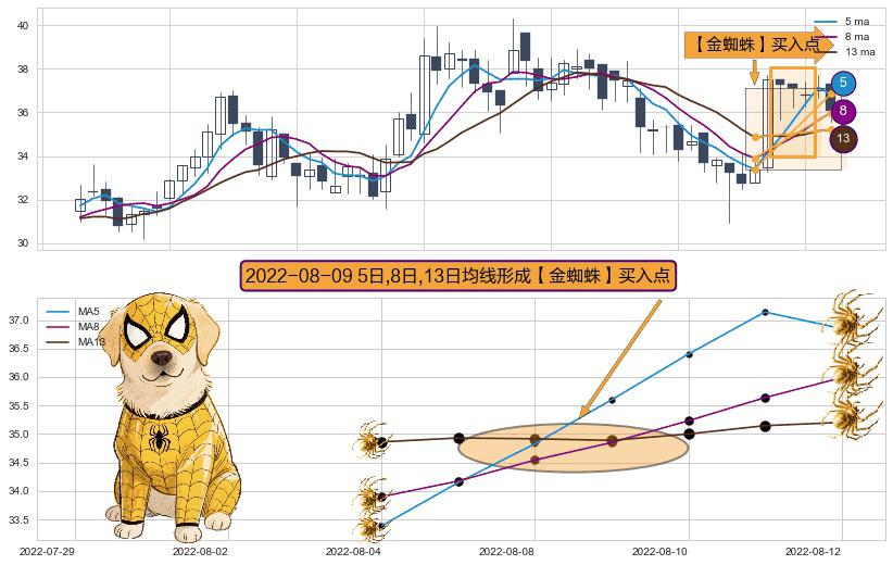 ⚀ 2022-08-09日显现 5日-8日-13日均线 【金蜘蛛】买入点 看多信号,后市看涨,买入