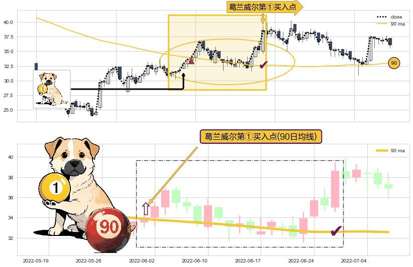 ⚀ 2022-06-01-日显现 葛兰威尔均线 90日均线 第买①入点 走势反转见底信号,后市看涨,买进信号
