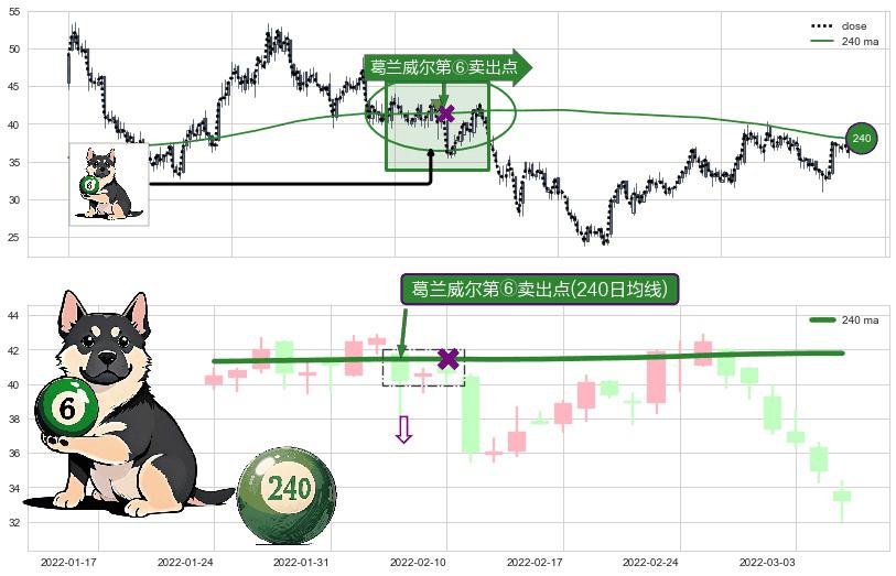 ⚀ 2022-02-08-日显现 葛兰威尔均线 240日均线 第⑥卖出点 走势反转见顶信号,后市看跌,卖出信号