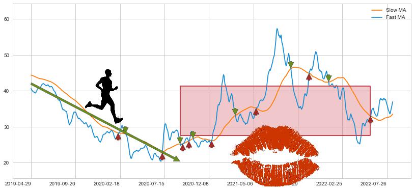 ⚅ 卖点向下突破均线后,价格走势有持续向下的迹象,但动能稍显不足,迟迟不能远离均线