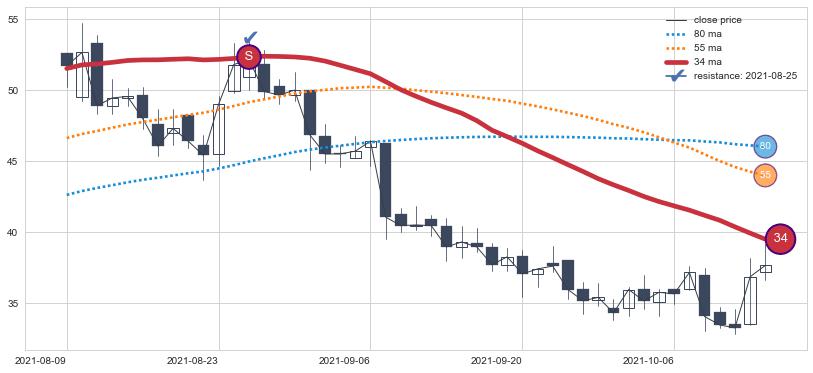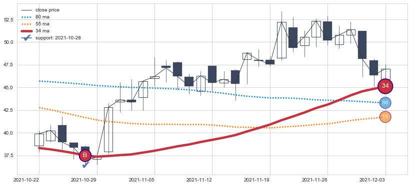 ⚁ MA3和MA8走势平行,且始终保持在短距离内,MA21始终在短中期均线下方,与短中期均线保持一定的距离,微微上行