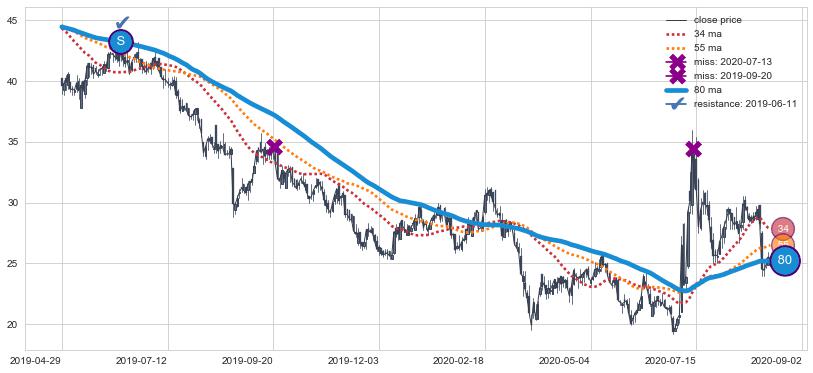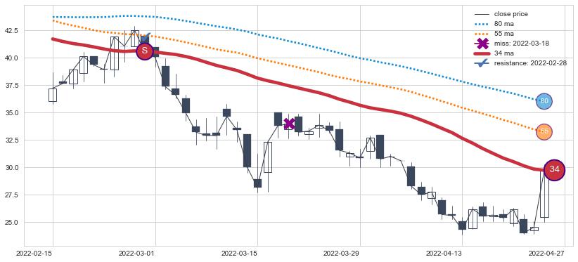 ⚂ 2022-06-28-日均线向上突破,2022-07-19-日重新下穿均线破位,均线阻力再次生效