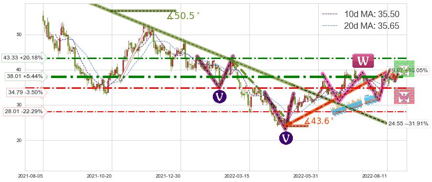♘ 阻力价格位43.33,可信任强度57.65%,距离最后交易2022-08-12形成的收盘价格36.05相差 +20.18%