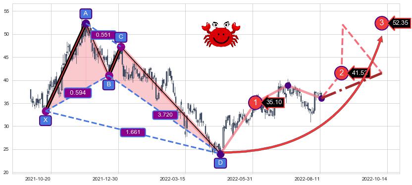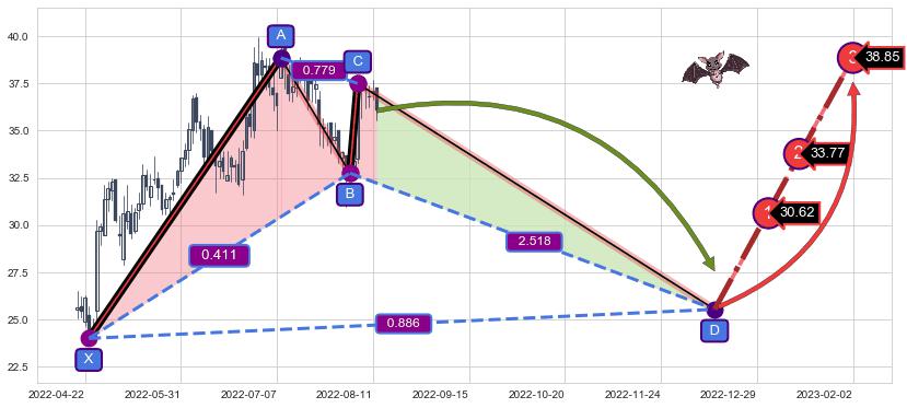 ➣ 未完成【蝙蝠】形态起点X: 2022-04-25, 已到达C点: 2022-08-05, 预测最终D点: 2022-12-14, 共164交易日