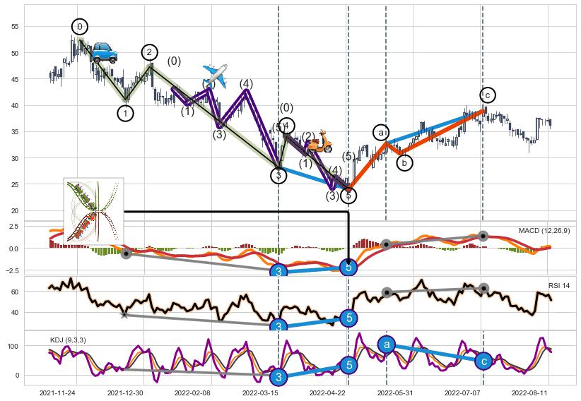 ➢ 1,3,5驱动浪MACD, RSI, KDJ走势都出现【常规背离】反转信号增强