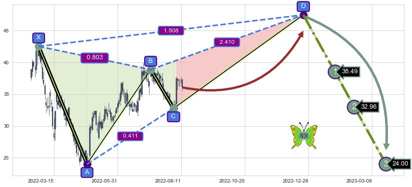 ➣ 未完成【蝴蝶】形态起点X: 2022-02-25, 已到达C点: 2022-08-03, 预测最终D点: 2022-12-23, 共204交易日