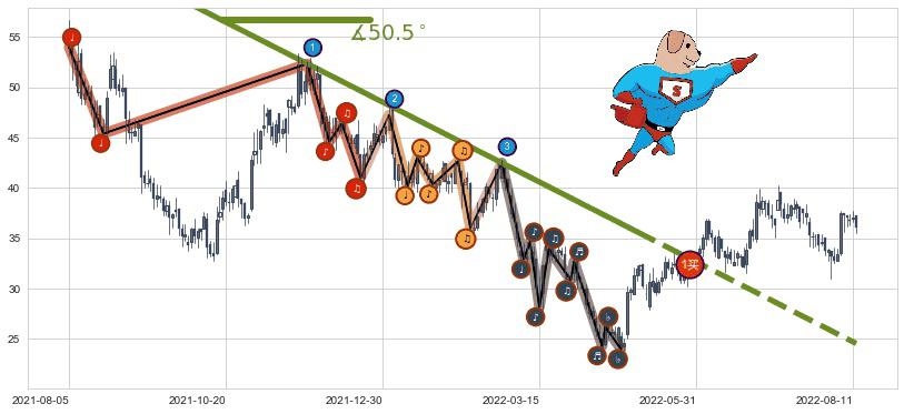 ➢ AI预测: 假定反转继续,第❸价格目标位置(2022-10-14, 52.35)