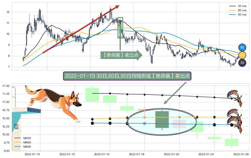 形态多维评估: ⚀ 2022-01-19日显现 30日-60日-90日均线 【绝命跳】卖出点 看空信号,后市看跌,卖出