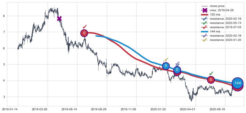 下跌趋势2019-01-14-2020-07-07,均线120, 144确认关键阻力4处