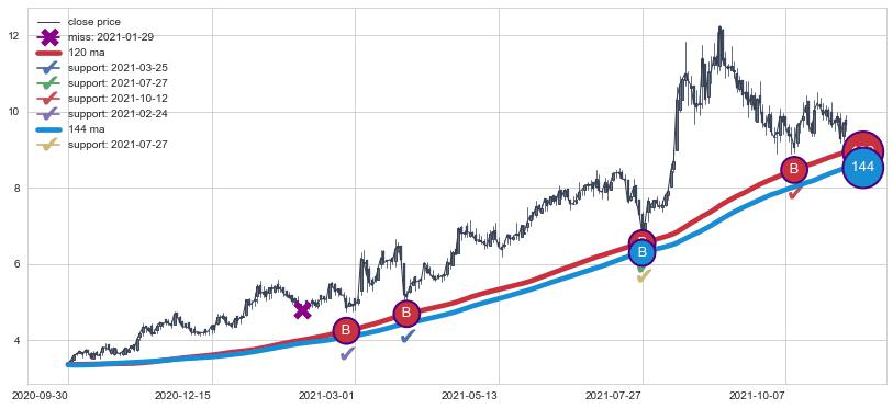 上涨趋势2020-09-30-2021-11-09,均线120, 144确认关键支撑4处