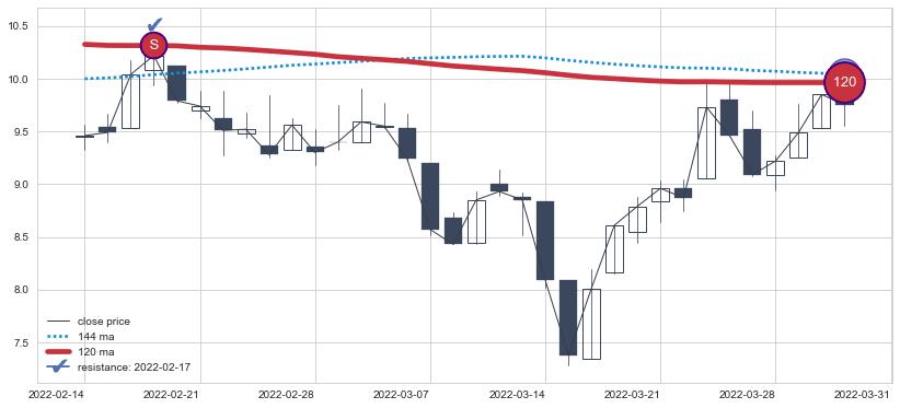 下跌趋势2022-02-14-2022-03-31,均线120确认关键阻力1处