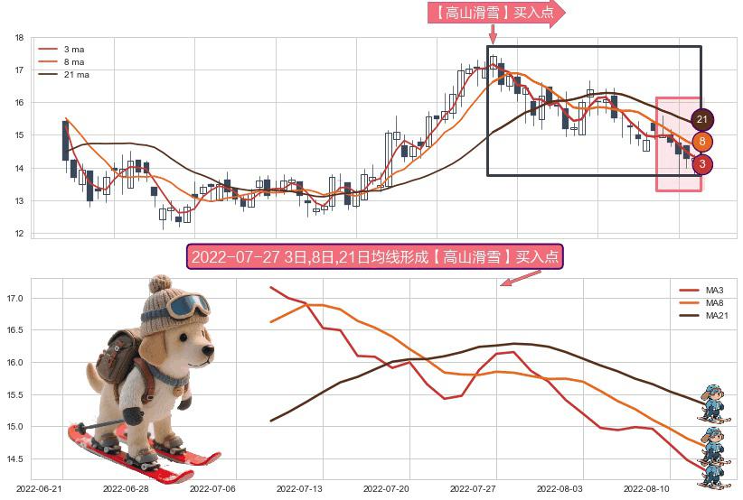 ⚀ 2022-07-08日-2022-08-12日显现 3日-8日-21日均线 【高山滑雪】买入点 看多信号,后市看涨,买入