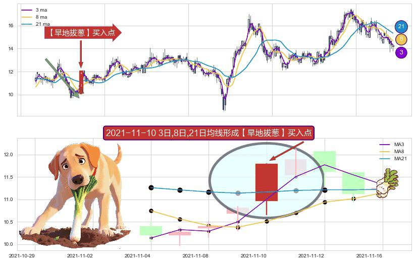 ⚀ 2021-11-10日显现 3日-8日-21日均线 【旱地拔葱】买入点 看多信号,后市看涨,买入