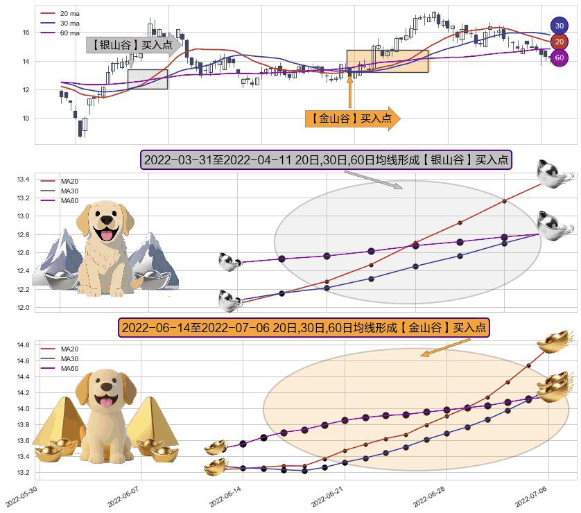 ⚀ 2022-06-15-日至2022-07-06-日显现 20日-30日-60日均线 【金山谷】买入点 其再次确认了买入信号,可靠性更强,买入