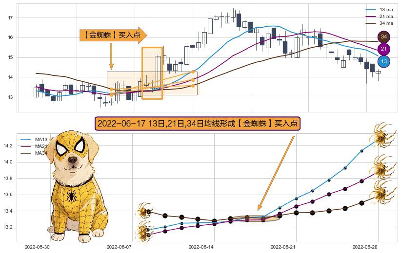 ⚀ 2022-06-17日显现 13日-21日-34日均线 【金蜘蛛】买入点 看多信号,后市看涨,买入
