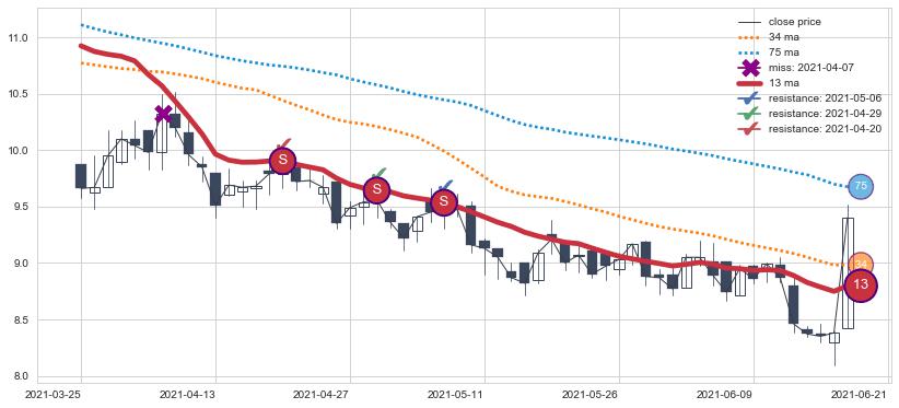 ⚀ 中期均线MA8下穿长期均线MA13形成的交叉是标准 死亡交叉