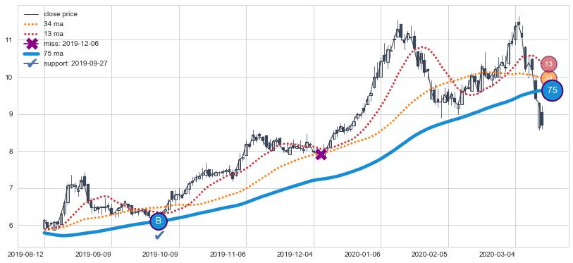⚅ 短期均线MA13上穿中期均线MA34形成的交叉是标准 黄金交叉