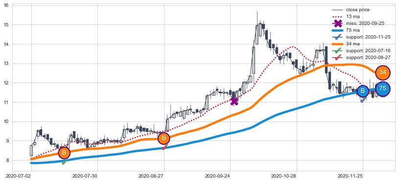 ⚀ 买点向上突破均线后,价格走势有持续向上的迹象,但动能稍显不足,迟迟不能远离均线
