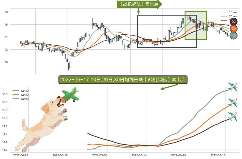 ⚀ 2022-05-23日-2022-07-14日显现 10日-20日-30日均线 【战机起航】卖出点 看空信号,后市看跌,卖出