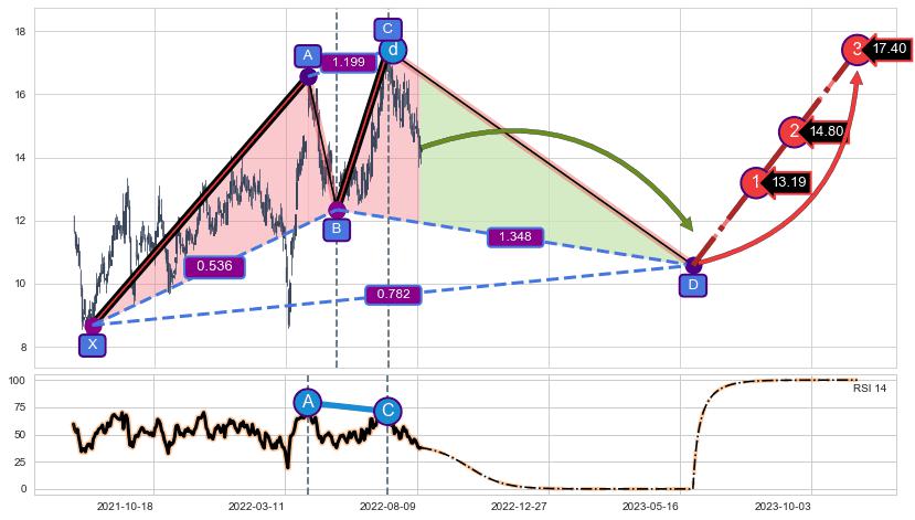 ➣ D点拟合预测价格10.58,距离最后交易收盘价格14.30相差 -26.01%