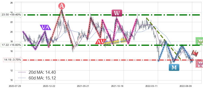 ♘ 阻力价格位17.22,可信任强度90.20%,距离最后交易2022-08-12形成的收盘价格14.74相差 +16.83%
