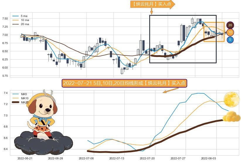 ⚀ 2022-07-05日-2022-08-05日显现 5日-10日-20日均线 【烘云托月】买入点 看多信号,后市看涨,买入