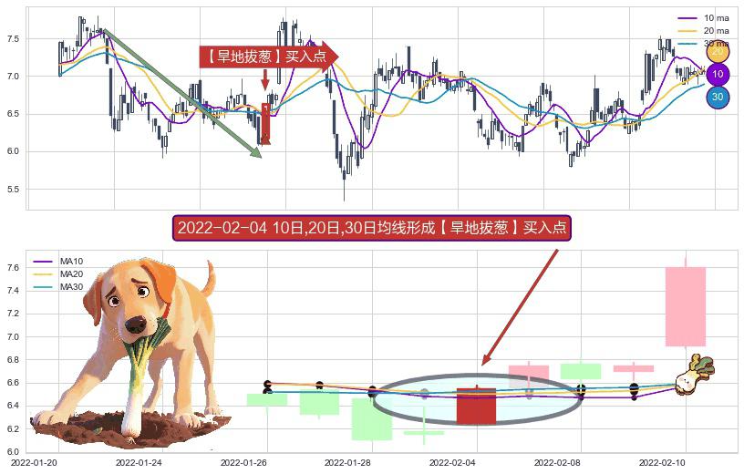 ⚀ 2022-02-04日显现 10日-20日-30日均线 【旱地拔葱】买入点 看多信号,后市看涨,买入