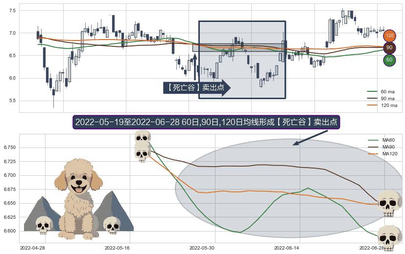 ⚀ 2022-05-20-日至2022-06-28-日显现 60日-90日-120日均线 【死亡谷】卖出点 看空信号,后市看跌,卖出