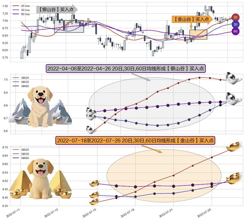 ⚀ 2022-07-19-日至2022-07-26-日显现 20日-30日-60日均线 【金山谷】买入点 其再次确认了买入信号,可靠性更强,买入