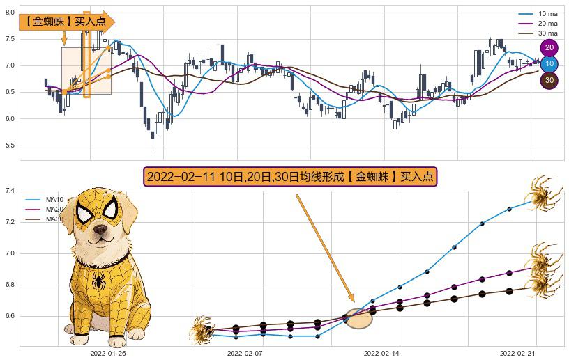 ⚀ 2022-02-11日显现 10日-20日-30日均线 【金蜘蛛】买入点 看多信号,后市看涨,买入
