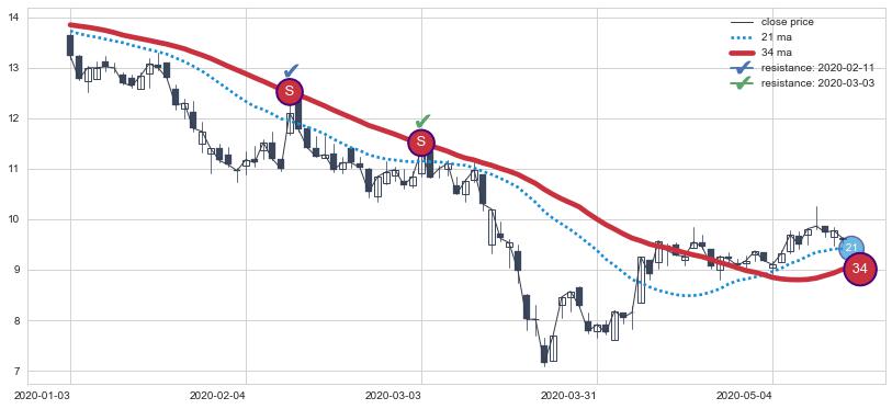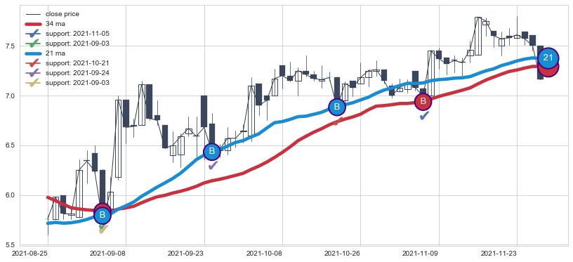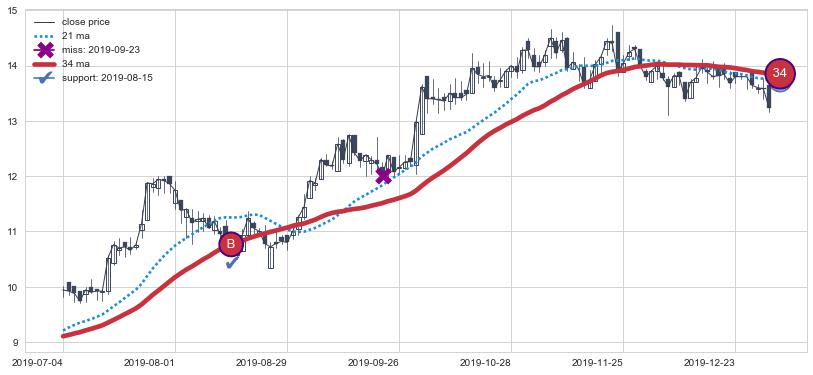➢ 最优均线组合共正确确认支撑阻力信号12处,正确确认率 80.00%