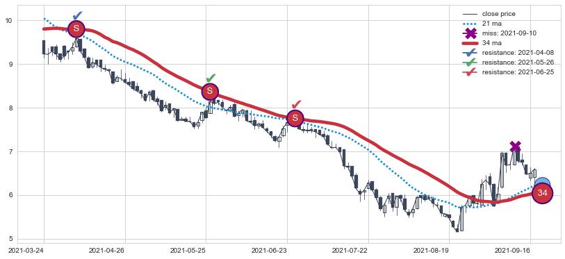 2021-03-24至2021-09-17 慢线与快线呈空头排列, 慢线与快线接触少,无缠绕