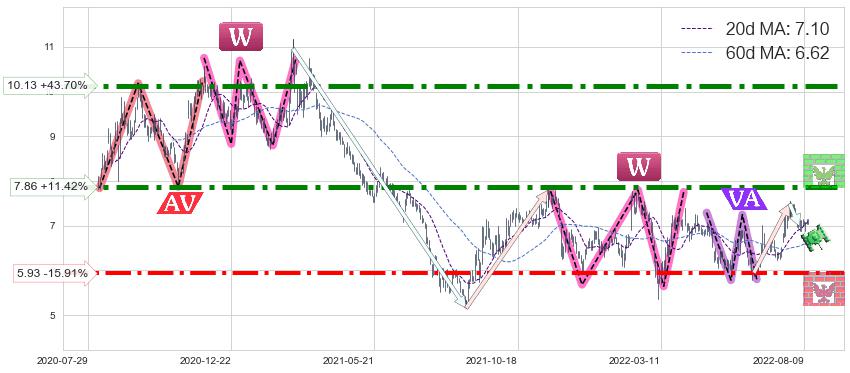 ♘ 阻力价格位7.86,可信任强度89.87%,距离最后交易2022-08-12形成的收盘价格7.05相差 +11.42%