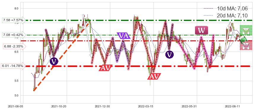 ♘ 阻力价格位7.08,可信任强度53.48%,距离最后交易2022-08-12形成的收盘价格7.05相差 +0.42%