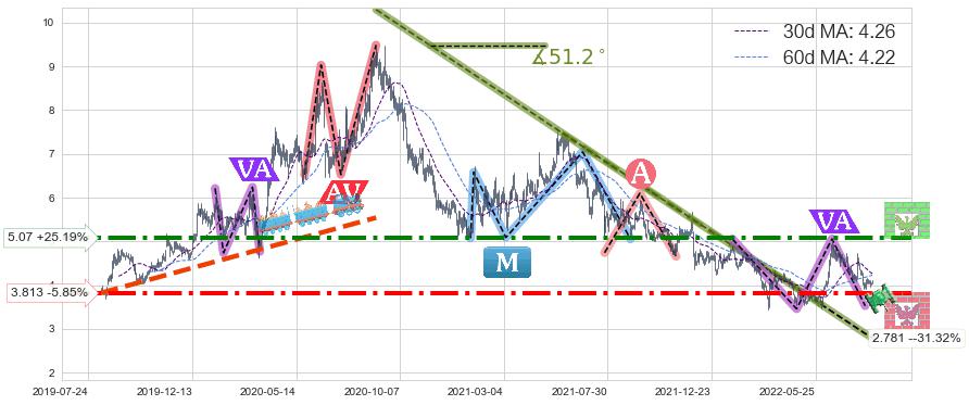 ➣ 【已确认突破】最后价格:4.05与最小【反转】第一目标价格→(2022-09-06: 2.349 )相较: 下跌空间【中等】