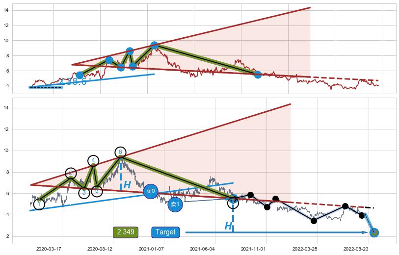 ➢ 最小反转跌幅→𝐇: 3.168 (逐步抬高阻力斜边最后的阻力点⑥与支撑边垂直距离)