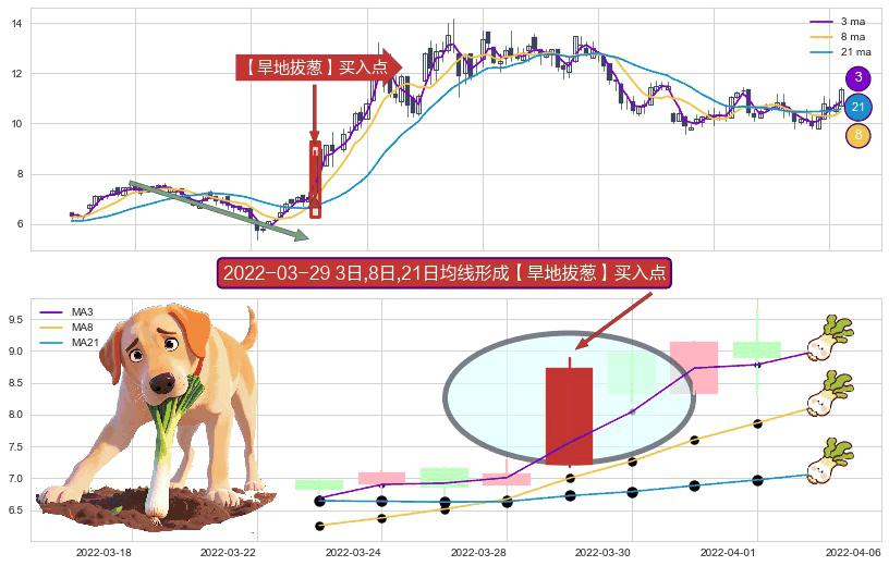 ⚀ 2022-03-29日显现 3日-8日-21日均线 【旱地拔葱】买入点 看多信号,后市看涨,买入